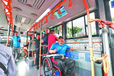 3月31日,人们登上公共汽车体验Yuom Shuangyuan手推车。